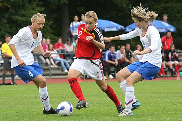die russische Stürmerin scheiterte. Die Aufmerksamkeit der Zuschauer wurde nun aber zusehens auf Aktionen gelenkt, die wenig mit Fussball zu tun haben: nicht nur, dass Deutschland aufgrund russischer Fouls eine wahre Freistoßflut in der zweiten Halbzeit zu verzeichnen hatte, vor allem Unsportlichkeiten