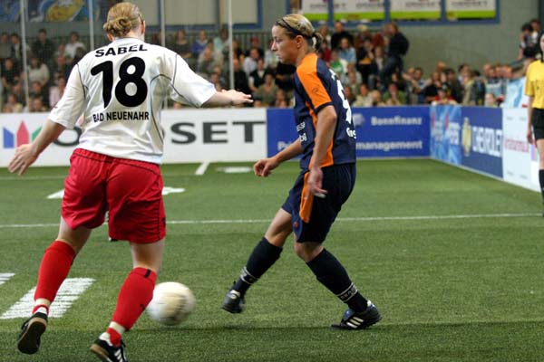 Das erste Halbfinale war vielleicht sogar die beste Partie des Abends. Die bisher starken Spielerinnen aus Neuenahr kämpften wacker gegen die deutlich besser als in der Vorrunde agierenden Duisburgerinnen. In der zweiten Minute konnte Neuenahr sogar die Halle zum Beben bringen, als Isabell Bachor ihre Mannschaft in Führung brachte - doch am Ende war der FCR zu stark und konnte durch Tore von Grings (6.) und Bajramaj (11.) den verdienten Sieg herausholen. ![]() ![]() ![]() ![]() ![]() ![]() ![]() ![]() ![]() ![]() |